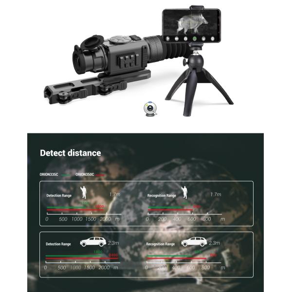 The Orion 335R and Orion 350R feature high shock resistance and can be used with rifled hunting weapon for such cartridges as 9.3х64, .30-06, .300, .375. etc, and with smooth-bore and airsoft weapons.The highlight of the ORION is the ability to link via Wi-Fi the device with mobile units using the free mobile application Cam802. The software connects the device with mobile unit (smartphone or tablet) which enables you to receive footage in the real-time mode, to distantly operate the device with your smartphone, as well to save the image/video captured by the device.